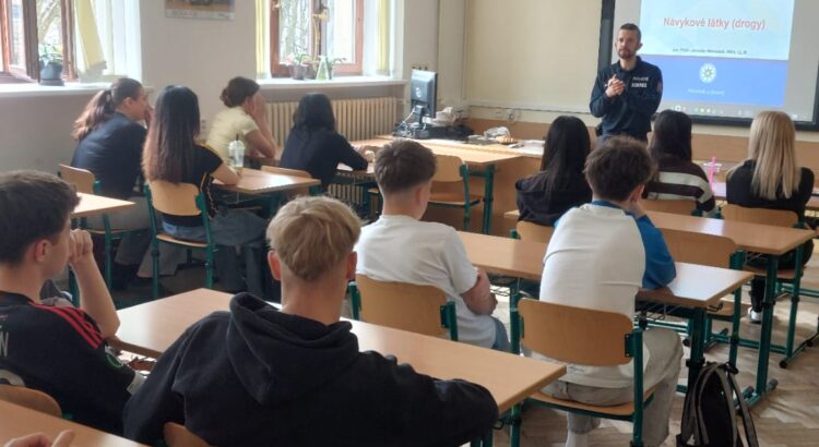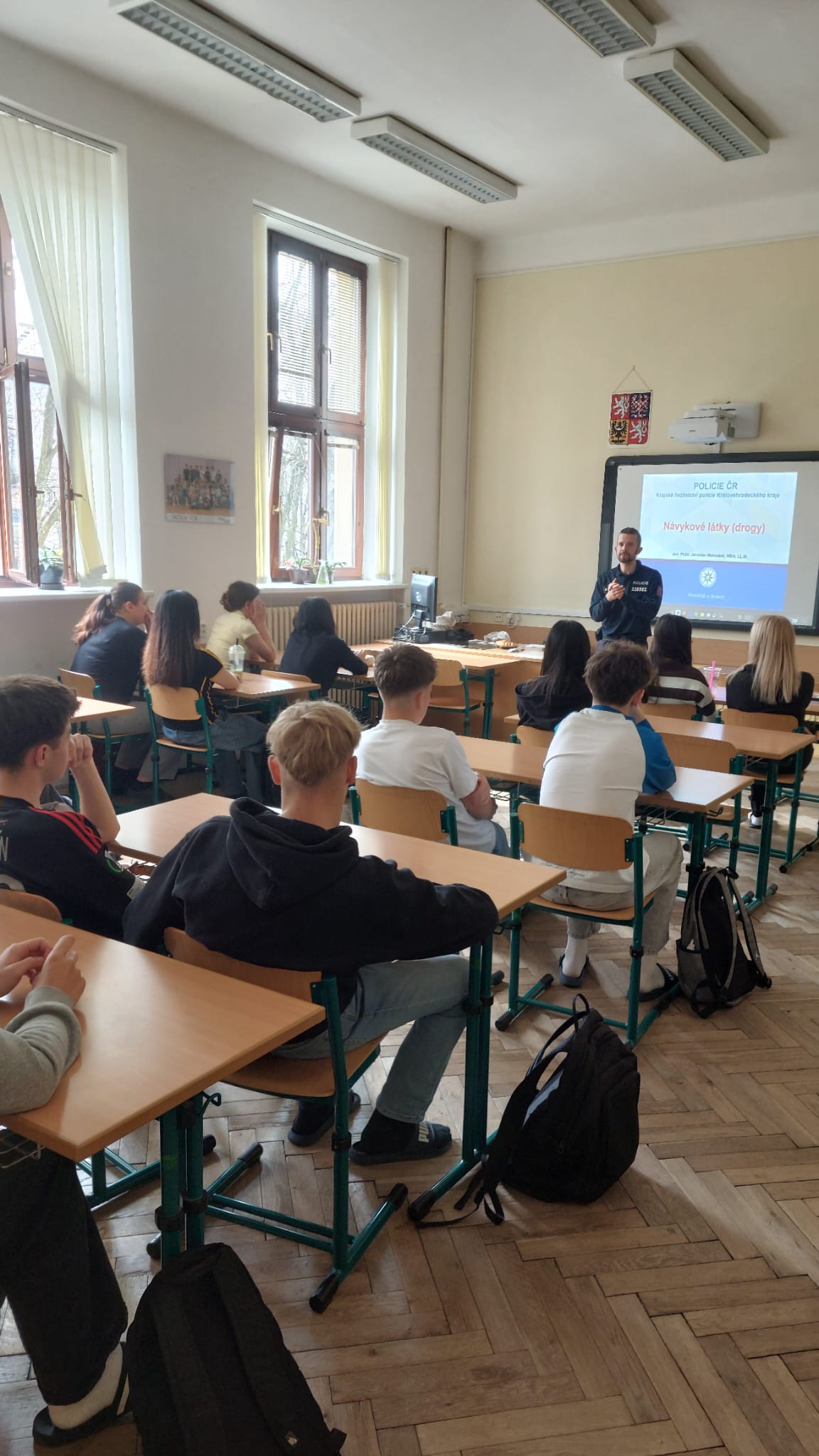 Dne 16. 4. 2026 se uskutečnila preventivní přednáška Policie České republiky na téma „Aktuální trendy v oblasti závislostí“. Přednášku vedl por. Mgr. Miroslav Mervart z Policie ČR a zúčastnila se jí třída 1. A.